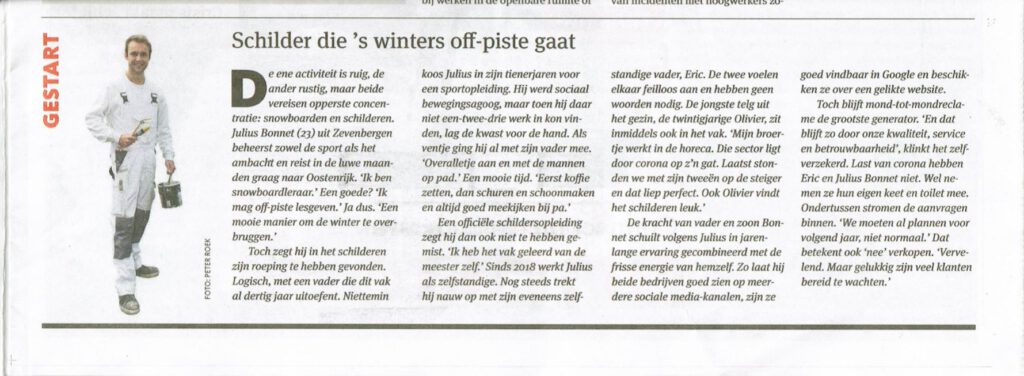 Bonnet Schilderwerken haalt de schilders vakkrant voor de 2e keer! In onderstaand artikel kan je lezen hoe Julius de bergen combineert met zijn passie voor schilderen. In de winter geven we in Oostenrijk les, terwijl we in de zomer in de zon staan op de steiger.