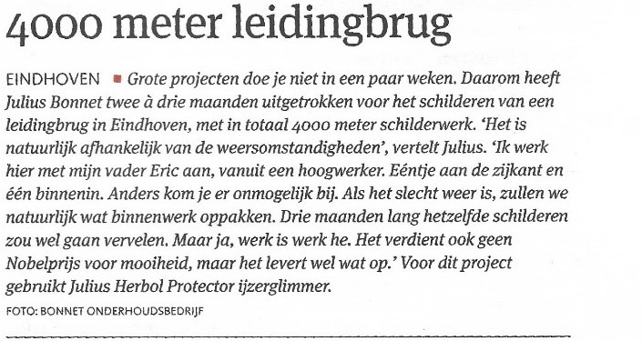 “Grote projecten doe je niet in een paar weken. Daarom hebben wij hier twee a drie maanden uitgetrokken voor het schilderen van een leidingbrug in Eindhoven, met totaal 4000 meter schilderwerk. ‘het is natuurlijk afhankelijk van de weersomstandigheden’. Ik werk hier met mijn vader Eric Bonnet aan, vanuit een hoogwerker. Eentje aan de zijkant en één binnenin. Anders kom je er onmogelijk bij. Drie maanden lang hetzelfde schilden zou wel gaan vervelen. Maar ja, werk is werk he. Voor dit project hebben wij Herbol Protector gebruikt.”